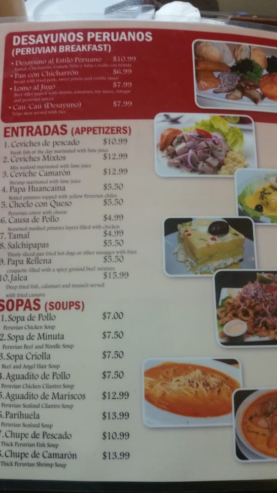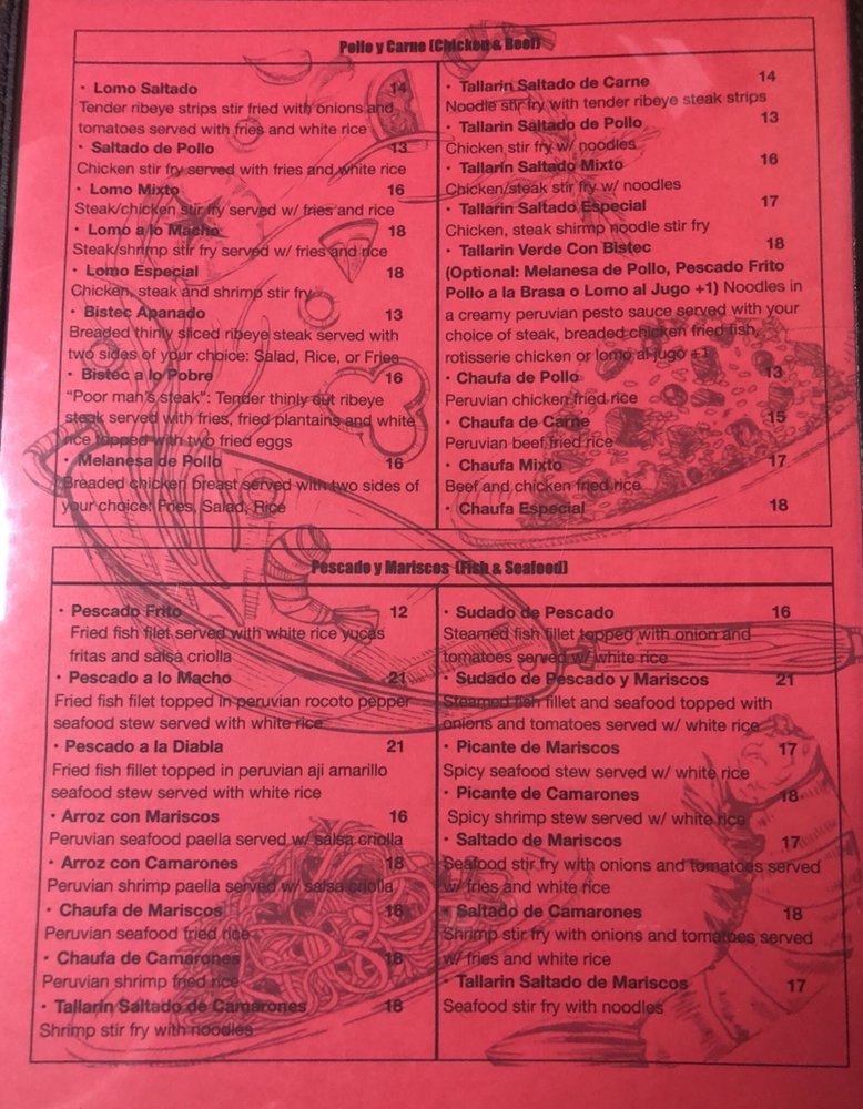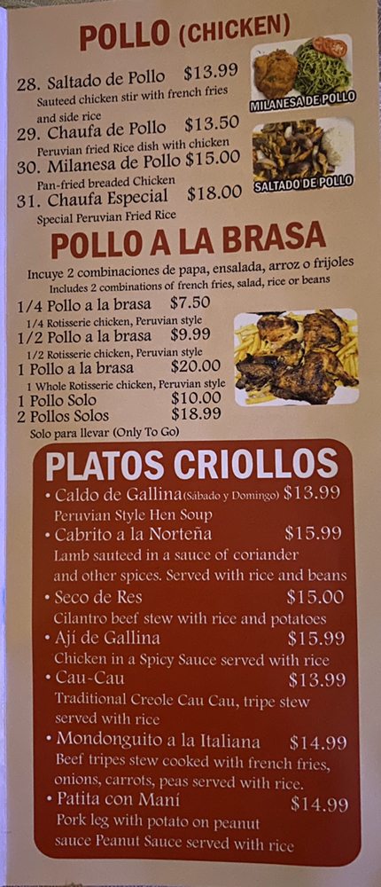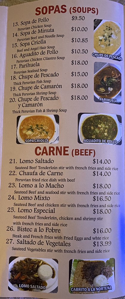 Start your meal with the Papa Huancaina, featuring perfectly boiled potatoes smothered in a spicy cheese sauce, or indulge in the zesty Ceviche CamarĂ³n. The hearty Aguadito De Pollo, a fragrant cilantro chicken soup, has earned rave reviews for its bold flavors and comforting qualities.